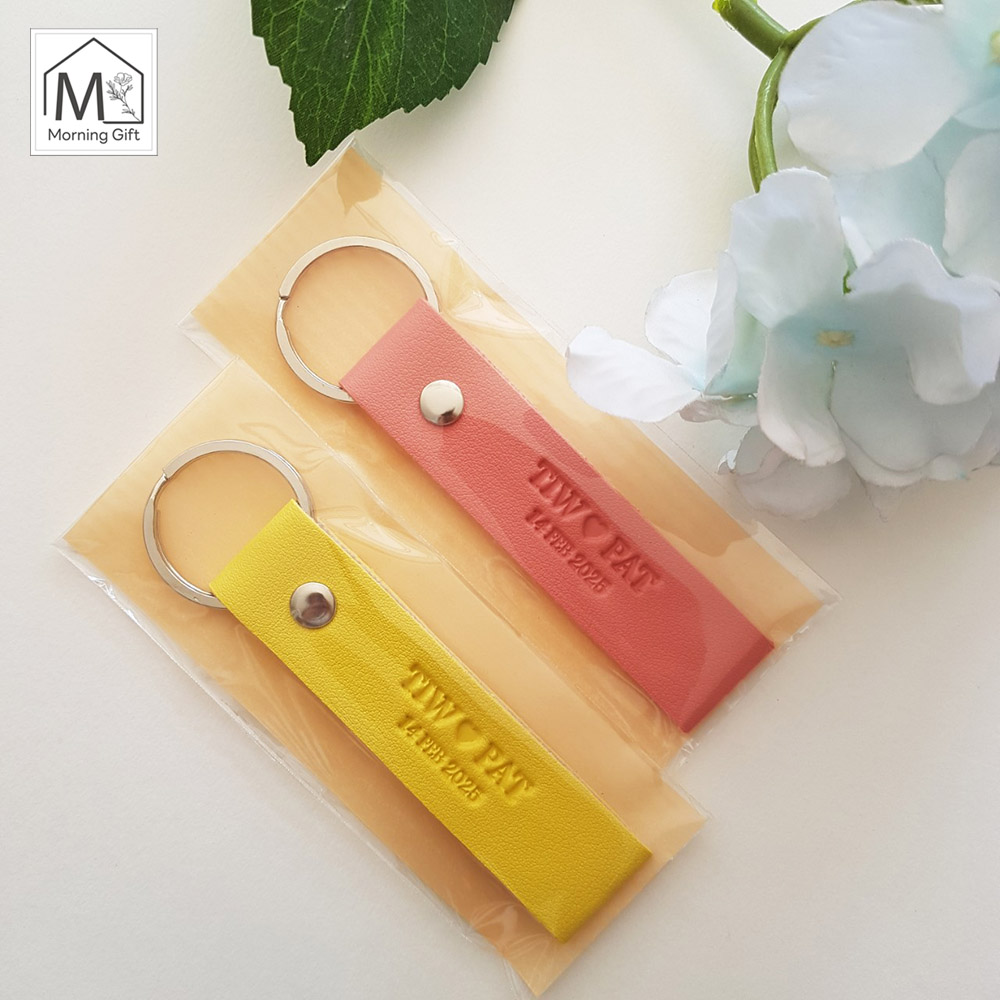 เรียบง่ายแต่เท่ ใช้งานได้จริง เหมาะกับคู่รักที่ชอบสไตล์ธรรมชาติ เพิ่มความอบอุ่นด้วยการปั๊มชื่อย่อบ่าวสาวลงบนป้ายหนัง แขกนำไปใช้ได้ทั้งในชีวิตประจำวันและการเดินทาง